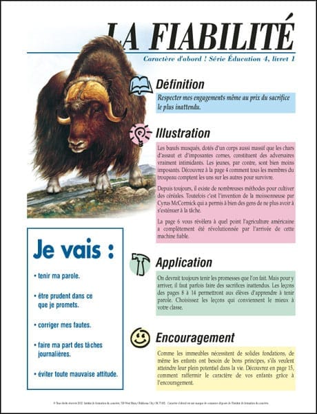 La qualité est présentée par des exemples de la nature et expliquée par des histoires et des activités. Les boeufs musqués, dotés d’un corps aussi massif que les chars d’assaut et d’imposantes cornes, constituent des adversaires vraiment intimidants. Les jeunes, par contre, sont bien moins imposants. Depuis toujours, il existe de nombreuses méthodes pour cultiver des céréales. Toutefois c’est l’invention de la moissonneuse par Cyrus McCormick qui a permis à bien des gens de ne plus avoir à s’exténuer à la tâche.